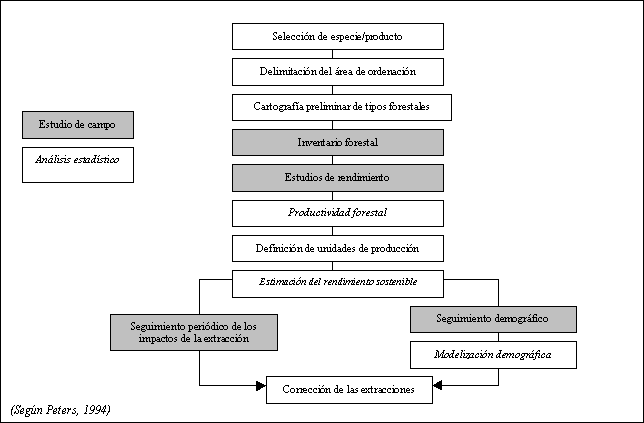 Todo programa de desarrollo de PFNM debe incluir evaluación y estudio en todas estas etapas. No todas ellas requieren evaluaciones formales porque puede disponerse ya de información o puede recopilarse mediante métodos informales. Las áreas en negrilla del diagrama sugieren dónde la evaluación de campo debe proporcionar teóricamente datos rigurosos biométricamente y fiables estadísticamente. En estas áreas deben utilizarse métodos cuantitativos.