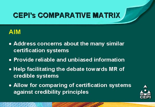 - the Confederation of European Paper Industries (CEPI) is supporting mutual recognition efforts through the development of a comparative matrix of different certification systems as an educational tool for its members and pulp and paper customers;