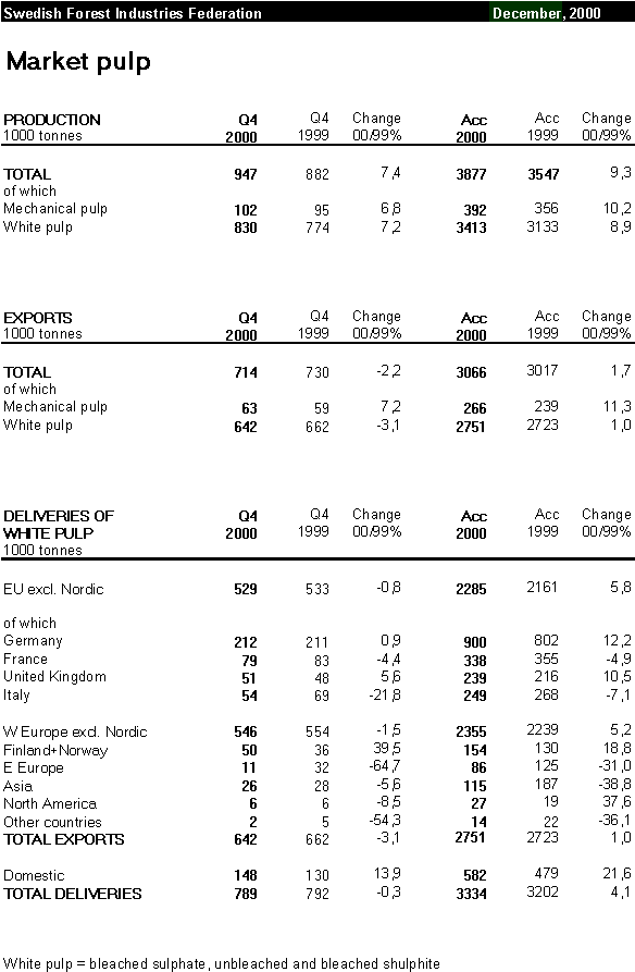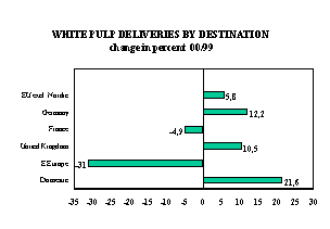 The production of white pulp for 2000 amounted to 3.4 million tonnes, up about 300 000 tonnes or 9 percent compared to 1999.