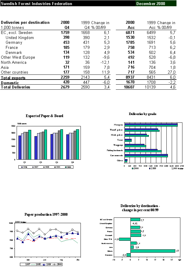 Exports of woodfree printing and writing paper continued to rise during the year to 1.7 million tonnes, 5 percent up on last year also exports of wood-containing printing and writing paper rose by 10 percent during 2000.