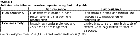 In order to get a sense of how the resilience and sensitivity of the soil to erosion interact to impact farm level incentives and constraints in managing the land base, a simple matrix as shown in Table 3 can be used. In addition to the two dimensions of resilience and sensitivity, a time dimension is included in the impact assessment in order to give a general sense of how the implications vary at different point estimates on the erosion and productivity functions.