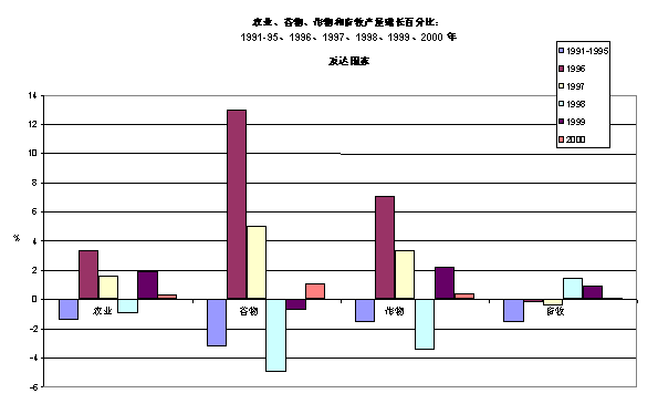 2. 增长放慢的原因是发达国家与发展中国家同时出现增长速度下降,其中发达国家的增长降到了0.3% 的创纪录低水平。在发达国家中,转型国家在1998 年下降6.8%、1999 年增长1.3%之后,2000 年农产品产量下降近2% 。