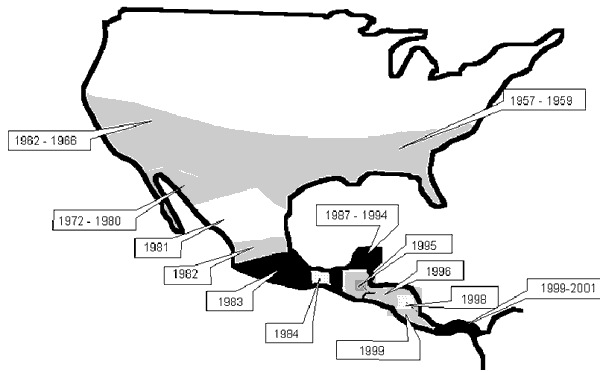 Progressive shift of New World screwworm eradication zones