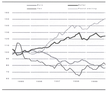 These are of major significance to the competitiveness and profitability of tropical exporting countries. Over the period 1997-2000 the most notable features of global exchange rates impacting tropical timber exporters have been the strength of the US dollar, the weakening of the Euro since its launch in January 1999, the relatively strong performance of the pound sterling, the weakness of the yen and the collapse of Southeast Asian currencies in 1997 and 1998 and their subsequent recovery. Figure 6.1 illustrates the relative movements of the US dollar, Euro, yen and pound sterling from 1995 to 2000.