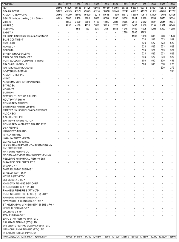 This paper was drafted as fisheries allocations in South Africa were undergoing a major revision. Therefore, it deals only with the recent allocation procedures; the outcome of the present process, which is expected to culminate in the issuing of "medium"term fishing-rights for the year 2002, may bear no resemblance to that presented herein. However, so as to present a balanced perspective, the views and procedures leading up to the 2002 allocations are also presented. Many of these may not be factors that are ultimately used by the State management authority in the 2002 allocations.