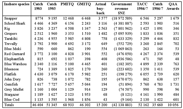 All units are tonnes except for "Government Revenue" in New Zealand Dollars. Ling and Red Cod were included in the buy-back, but had large proportions of their catch taken by charter and foreign vessels that make the TACCs non-comparable with earlier domestic catch. In1998, the buy-back portfolio of quota in the table was valued on the quota market at approximately $NZ150m.