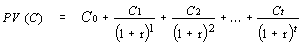 The NPV is derived by subtracting the sum of the Present Value (PV) of a cash flow of costs from the sum of the PV of a cash flow of revenues. The PV of the costs is represented by the following formula: