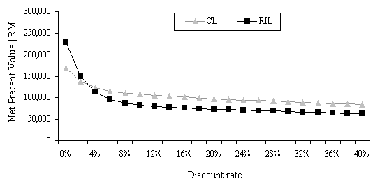 The NPV and BCR indicate that both management options are financially profitable. It is probably not the absolute figures but the relative ratios that are interesting. The CL is slightly more profitable and exceeds the NPV of the RIL system by a factor of 1.3.