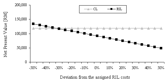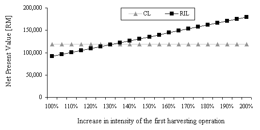 The effect of changes in RIL harvesting costs is illustrated in Figure 6. Leaving other factors unchanged, a reduction of more than 30% in harvesting costs is required to make the RIL system more profitable than the CL system.