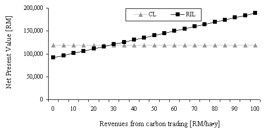 The sensitivity analysis relating to international carbon trading agreements indicates that at least RM 30/ha of annual carbon trading payments would be required to make the RIL system more profitable than the CL system (Figure 8).