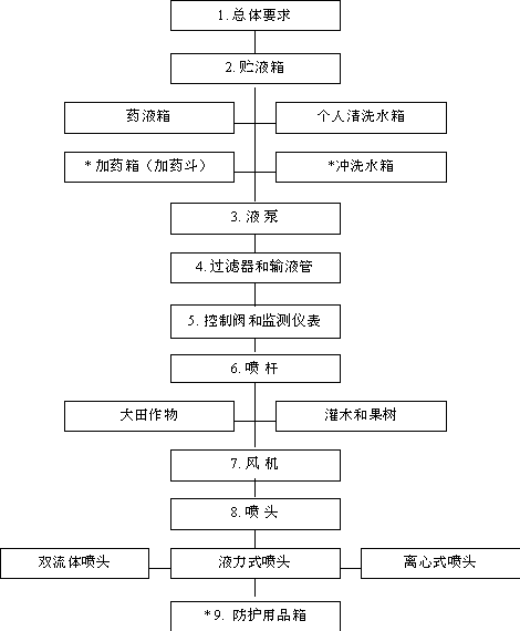 * 药液箱容量超过1000升的喷雾机必须配备 下面的技术规格适用于所有在地面使用的、与拖拉机联合使用的、或安装在专用底盘上的、或安装在多用途农业/园艺机动车上的农用喷雾机具。为方便起见,本准则把这些类型的喷雾机具统称为“喷雾机”。 1. TR 模块 1 – 总体要求喷雾机应该安全、可靠,能在田间实际条件下有效地作业。喷雾机应该用坚固、耐用的材料制成,在田间使用时,这些材料不会明显地发生不适当的损坏,否则,因为腐蚀、生锈、变形或过早地磨损会影响喷雾机的安全性,降低作业效率。 为达到粮农组织标准,喷雾机应该符合下面的要求。 1.1 喷雾机与拖拉机的连接应牢固可靠。 检查 1.2 所有的驱动轴应有足够的防护装置,以使运动部件不会暴露在外。 检查 1.3 能造成人体伤害的潜在危险部位,例如在喷杆折叠或喷杆调整过程中对人的意外伤害,应该装配有防护装置。在无法安装防护装置的部位,喷雾机应该配有合适的、清晰的警示标志。 检查 1.4 所有的手柄、把手或手把,与任一铰链点的间距至少要有300毫米。 测量 1.5 液压装置的连接应该采用快速接头系统,在175巴的压力条件下,每一次接合/分离操作,液压油的泄漏量不应超过2.5毫升。 渗漏测试应该在额定压力(厂家推荐的最大压力)下,在每一次结合/分离操作时测量,可使用已知重量的、清洁的、吸湿的棉签,通过称量记录棉签擦拭渗漏液后增加的重量,就能测量出液压油的泄漏量。 测试 1.6 备有1000升或更大药液箱的喷雾机,应该装配一个低位置的灌水加药系统。 检查 1.7 当用人工灌水加药的情况下,操作人员应该能够站在地面上、或站在面积不小于0.5米2的专用平台上往药液箱加药或加水。 测量 1.8 专用平台应用防滑板制成,周围有护栏。 检查 1.9 从地面或平台到加液口的距离不应超过1.0米,加液口周围在水平方向上应有0.3米宽的无障碍区。 测量 1.10 在厂家推荐的最大加液速度下,药液箱加液系统应该满足安全、容易地加注药液,不会发生药液溢出或飞溅。 1.11 喷雾机以额定压力和流量工作,不得出现漏液现象。 1.12 喷雾机的内部和外表都必须很容易被彻底清洗,要避免粗糙的表面和难以清洗的凹坑。 检查 1.13 喷雾机的外表面不应潴留或持留喷雾药液。 检查 1.14 喷雾机的外表应无尖角锐边、粗糙的磨削面或多余的凸出部分,以防伤害操作人员。 检查 1.15 喷雾机内药液喷到通常认为喷完的状态时,残留在喷雾机(药液箱、液泵、输液管和喷杆)内的药液不得超过规定的限制标准。 测试程序6 1.16 对于牵引式喷雾机,不论药液箱中装有多少药液,当与牵引拖拉机分开后,喷雾机不论以任何方向放置,都应该能平稳地站立在15%(1 : 7)的坡度的斜坡上。 测试 1.17 不需用特殊工具(也就是:专门为喷雾机设计的工具),就能很容易地进行喷雾机上所有部件的操作、维修、调整和清洁工作。 检查 1.18 生产厂家必须与喷雾机一起提供简单、明了并有图解的说明书。说明书用生产厂所在国以及英语、法语或西班牙语等文字书写。 检查 1.19 说明书中应该包括下列内容: