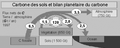 Figure 1Le cycle du carbone terrestre: le carbone du sol et le budget mondial du carbone d'après le Programme International Géosphère Biosphère (IGBP,1998) et (IPCC, 2000)