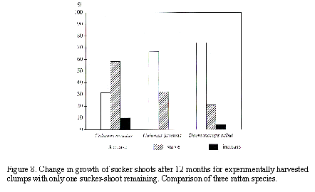 Looking at the number of shoots for the various growth stages, a similar pattern can be discerned (Table 9). In Calamus ornatus hardly any change was observed in the number of shoots compared with an increase in juvenile and mature shoots in C. javensis, which is only achieved at the expense of sucker and immature shoots, and with Daemonorops sabut where there is a reduction in all growth stages, except for the mature stage.