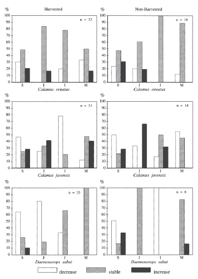 On a per clump basis, the dynamics of the various classes for the three species is clearly different (Figure 9). For Calamus ornatus the percentage of clumps that are stable is always highest for all classes. In C. javensis clumps are very dynamic and the percentage of stable clumps is always smaller than those showing either an increase or a decrease, except for clumps belonging to the mature class. For Daemonorops sabut an overall negative effect can be discerned, with the percentage of plants showing a decrease in shoot number always being greater than those showing an increase.