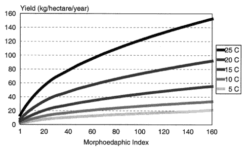 The simplicity of the MEI, and its generally good predictive capabilities have resulted in its application worldwide, subject to regional modifications. Generally, the MEI demonstrates that as nutrients in the water increase and depth decreases, fish production increases. Jenkins (1982) emphasized that relationships can be curvilinear, with greatest predictability within intermediate ranges for MEI and less fit at extremes. Schlesinger and Regier (1982) expanded the model to incorporate temperature effects, and subsequently enhanced its global applicability. Figure 2 depicts theoretical MEI yield estimates for lakes having annual mean temperatures ranging from 5°C to 25°C using the model developed by Schlesinger and Regier (1982). Table 1 estimates fish yield for hypothetical reservoirs having surface areas of 100 to 10 000 ha, depths of 5-15 m, total dissolved solid (TDS) concentrations of 50 to 200 mg/l, and temperatures of 5°C, 10°C and 25°C.