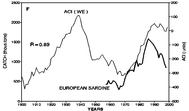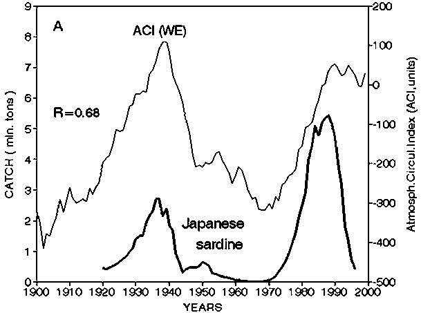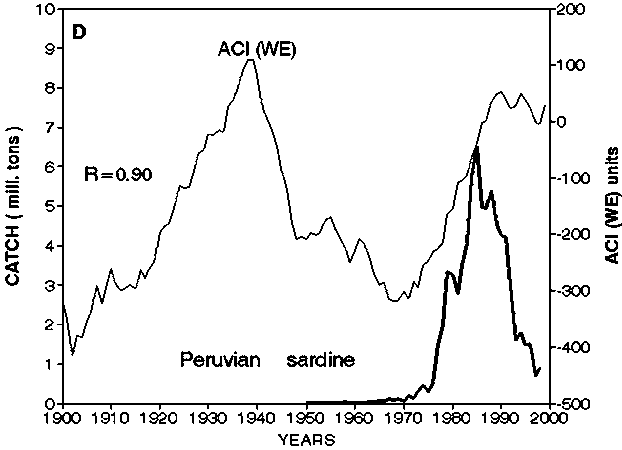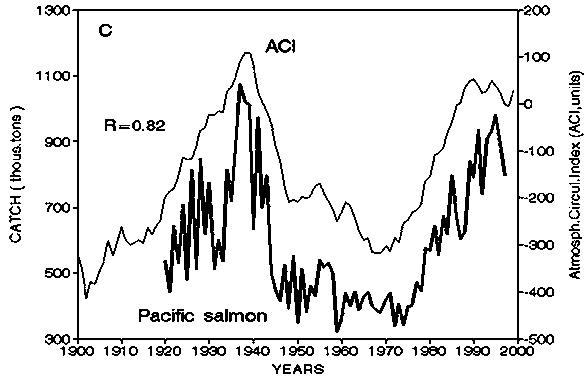 Figure 3.3 Correlation between dynamics of "zonal" ACI and catch of the major commercial "zonal-dependent" species.