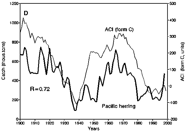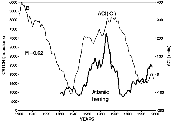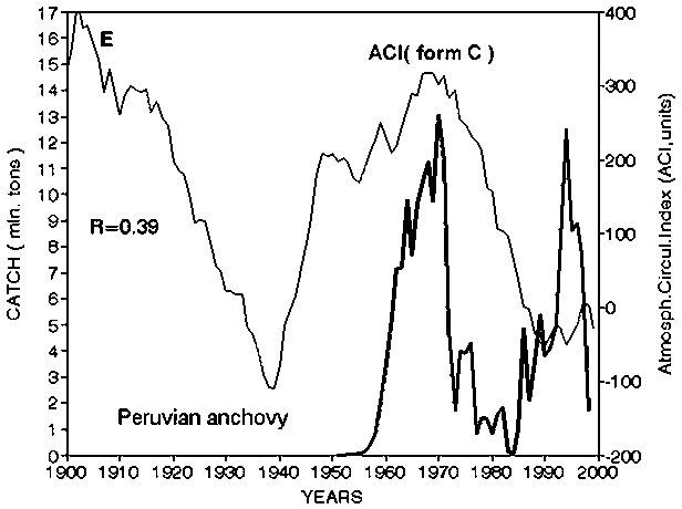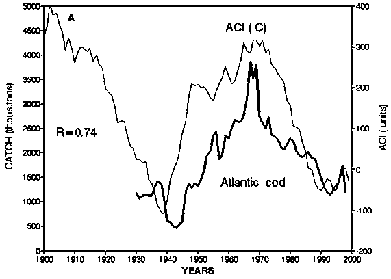 Figure 3.4 Correlation between dynamics of "meridional" ACI and catch of the major commercial " zonal-dependent" species.