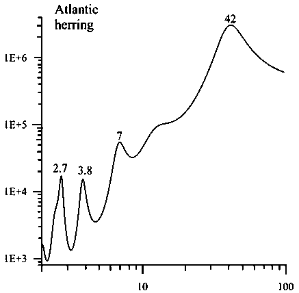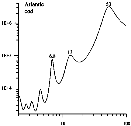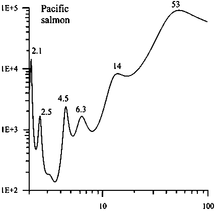 Figure 6.1 Power spectra estimates of the fish catch time series (abscissa- periods, years; ordinate-relative variance) (see text for details).