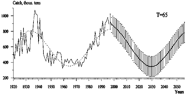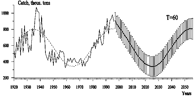 Pacific salmon catch, 1920-1996, thick solid lines with standard deviations