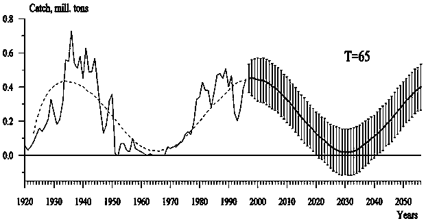 Californian sardine catch, 1920-1996, thick solid lines with standard deviations