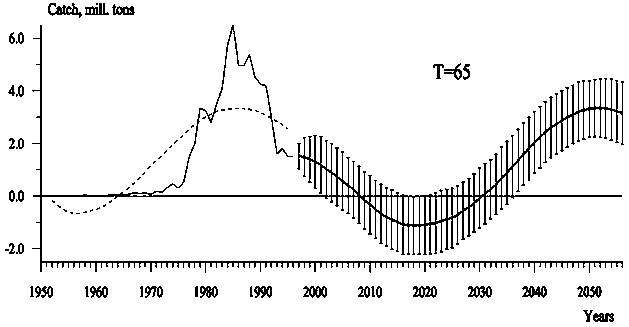 Peruvian sardine catch, 1950-1996, thick solid lines with standard deviations