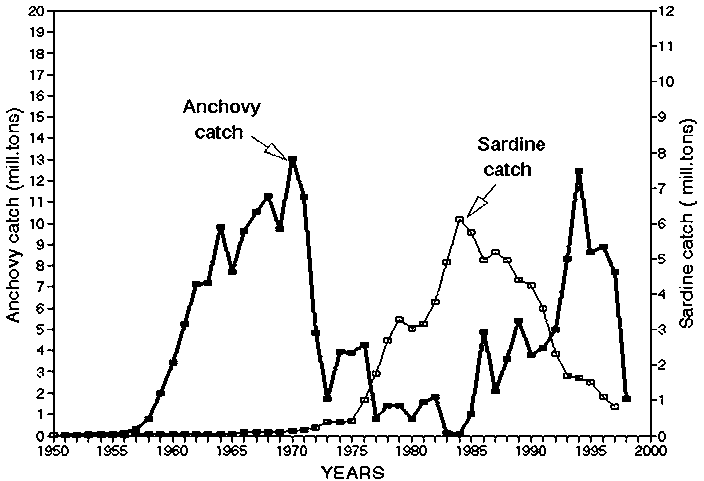 Figure 10.3 Dynamics of Peruvian anchoveta and Peruvian sardine catch 1950-1998