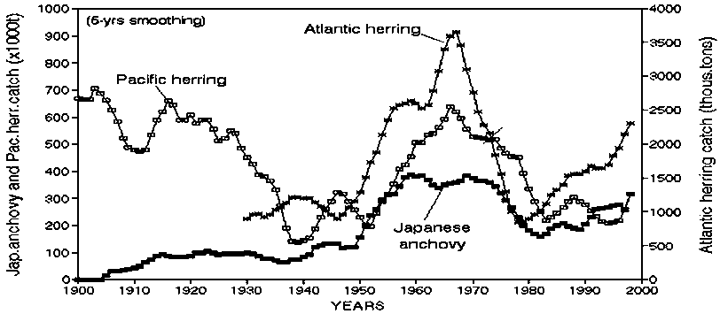 Japanese anchovy catch appears to be in phase with the dynamics of other "meridional-dependent" species. The catch series for Japanese anchovy, and Pacific and Atlantic herring suggest tentatively that the population dynamics of all these species are generally in phase (Fig. 10.5). Figure 10.6 shows that the catch dynamics of Pacific herring, and Japanese and Peruvian anchovy are in reasonably good agreement with the dynamics of "meridional" Atmospheric Circulation Index. This is supporting evidence for the dependence of these species on the dynamics of global climatic indices (See Chapter 2).