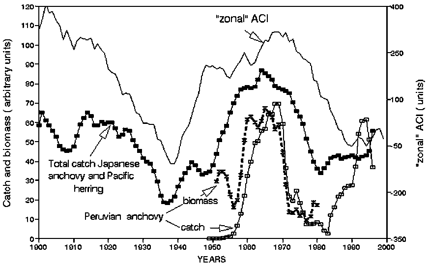Figure 10.9 superposes the global climatic indices, and catches and abundance of "meridional-dependent" fish species. It is clear that the dynamics of "meridional" ACI; Peruvian anchoveta biomass (VPA-III), abundance (shifted reconstructed series), and catch, Japanese anchovy catch; and Pacific herring catch are all temporally related.