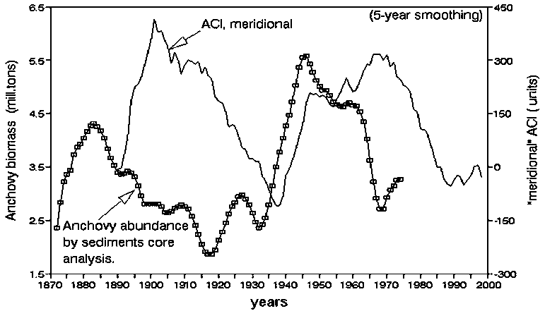 The same discrepancy is present between the anchovy reconstructed series and the "meridional" ACI (Fig.10.8). Both curves are similar in shape and period (about 65 years), but the ACI curve is ahead of the reconstructed population curve by 10-15 years. This inconsistency could be the result of problems with dating procedures for sediment cores.