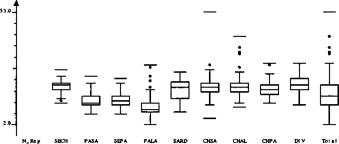 In the illustration below, the length of boat by licence-type, in a sample of the Moroccan coastal fleet, is compared on the basis of quantiles, and illustrated by box plots. The vertical axis corresponds to boat-length. Each box is delimited by the quartiles Q1 and Q3, whose variation Q3-Q1 corresponds to 50% of the vessels that are longer than the centre of the distribution. The horizontal line in the centre of the box represents the median value: if this line is in the middle of the box, it indicates that the distribution of the variable is symmetrical. The two ends of the vertical bars correspond to the values of the first and last percentiles (C1 and C99) and delimit 98 % of the sample distribution (= 497 boats); the points below or above the C1 and C99 percentiles correspond to the 1 % of the boats which have a value for this variable outside the distribution (e.g.: PALA or CHAL). The two extremes indicate the minimum and maximum values of the variable. For example, in this representation it can be seen that the "longline" fishing boats are smaller than the trawlers or the sardine boats, and that the seiner-trawlers are the most homogeneous group of boats in length (the box plot is small).