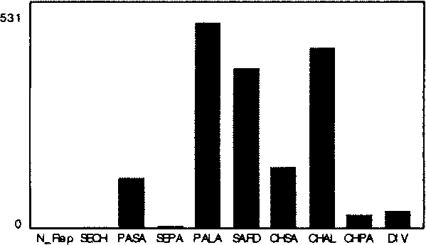 The comparison of the "type of fishing licence" frequency distributions between the sample and the total fleet (from which the sample is taken = boats in the file " licence 96") is illustrated by the frequency distribution histograms of the two data files (i.e. the 497 fleet sample individuals and 1,777 total fleet individuals partitioned amongst the 9 classes of the qualitative variable "fishing method"). The comparison between the two graphs shows that the sample over-estimates the sardine boats and underestimates the longliners compared to the information available in the master-file on licences operational in 1996. It would therefore be necessary to "rectify" or account for this bias in the sampling when conclusions are extrapolated to the entire coastal fishing fleet. Fleet Sample |