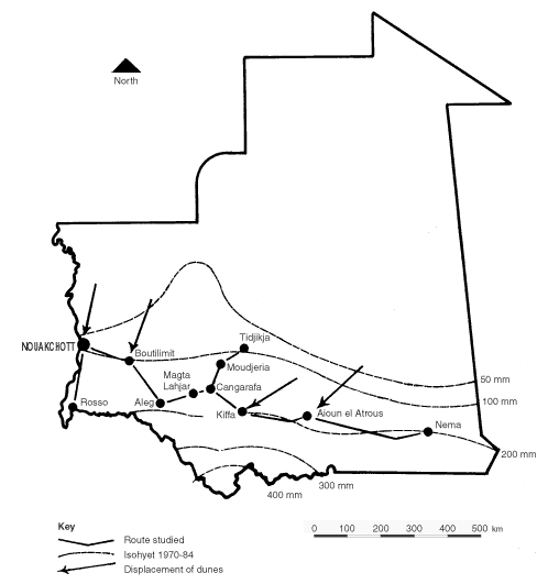 Map of Mauritania, showing the segments of the road studied, isohyets and the direction of the displacement of dunes