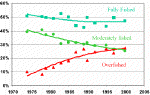الشكل 4: الإنتاج الغذائي السمكي المطلق للفرد من مصايد الأسماك البحرية الطبيعية في العالم وفي العالم باستثناء الصين (1950-1999)