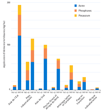 L'un des principaux moyens pour les agriculteurs d'accroître les rendements consiste à utiliser davantage d'engrais. Un tiers de l'augmentation de la production mondiale de céréales dans les années 1970 et 1980 a été attribué à l'utilisation accrue d'engrais. En Inde, c'est même la moitié. Le degré d'utilisation des engrais varie énormément suivant les régions. L'Amérique du Nord, l'Europe occidentale et l'Asie de l'Est et du Sud représentaient les quatre cinquièmes de l'utilisation mondiale d'engrais en 1997-99. Les taux les plus élevés, atteignant en moyenne 194 kg d'éléments fertilisants par hectare, étaient appliqués en Asie de l'Est, les pays industrialisés venant en deuxième position avec 117 kg/ha. A l'autre extrémité de l'échelle, les agriculteurs d'Afrique subsaharienne n'en utilisaient que 5 kg/ha. La consommation mondiale d'engrais a connu une rapide hausse dans les années 1960, 1970 et 1980, mais elle a considérablement ralenti dans les années 1990. Dans les pays industrialisés, le fléchissement a été dû principalement à la réduction du soutien gouvernemental à l'agriculture et à la montée de la préoccupation environnementale. Dans les pays en transition, la consommation d'engrais a de même rapidement baissé, mais pour des raisons différentes, à savoir la récession et la restructuration. Même dans les pays en développement, le taux de croissance de l'utilisation d'engrais dans les années 1990 avait chuté à moins de la moitié du chiffre des décennies précédentes. On prévoit la poursuite de cette croissance ralentie. La consommation mondiale d'engrais devrait augmenter en moyenne de 1 pour cent par an au cours des trois prochaines décennies (un peu plus vite dans les pays en dévelop-pement, et un peu moins dans les pays développés). C'est en Afrique subsaharienne que les taux de croissance seraient les plus élevés. On n'y utilise actuellement que très peu d'engrais, et donc ces taux de croissance rapides pourraient ne se traduire en réalité que par de faibles augmentations absolues. |