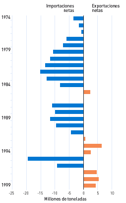 Los exportadores de cereales hicieron frente perfectamente al aumento de la demanda duplicando su nivel de exportaciones. Los exportadores tradicionales como América del Norte, Australia, Argentina y Uruguay desempeñaron bien su papel. Estos países tienen el potencial necesario para seguir haciéndolo. Pero la mitad aproximadamente del aumento total de las exportaciones provino de un nuevo participante, la UE. De ser un importador neto de 21 millones de toneladas de grano anuales a mediados de los años setenta, la UE pasó a ser un exportador neto de 24 millones de toneladas anuales en 1997-99. Inicialmente, una gran parte de este cambio fue el resultado de fuertes políticas proteccionistas y de apoyo a los precios. Diversas reformas políticas de la UE han hecho, desde entonces, que los precios internos se pongan en general al nivel de los precios internacionales, pero es probable que la UE siga siendo un exportador neto importante, incluso si se incrementa el grado de liberalización de su comercio.