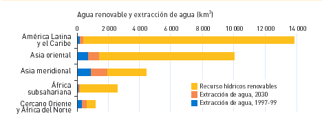 En 1997-99, en el conjunto de los países en desarrollo, sólo se extrajeron el 7 por ciento aproximadamente de los recursos hídricos renovables para regadío. Pero a causa de diferencias en el rendimiento y la disponibilidad de agua, algunas regiones utilizaron una proporción mucho más alta que otras. En el África sub-sahariana, donde el regadío está menos difundido, sólo se utilizó el 2 por ciento y en América Latina, rica en agua, un simple 1 por ciento. En contraste, la cifra correspondiente Asia meridional fue del 36 por ciento y en el Cercano Oriente y África del Norte no inferior al 53 por ciento.