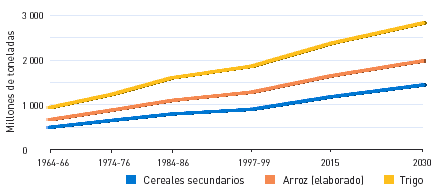 Arroz. Este cultivo se utiliza en su inmensa mayoría para consumo humano directo y representó el 21 por ciento del consumo mundial de cereales en peso en 1997-99. El consumo medio de arroz per cápita en los países en desarrollo se ha ido estabilizando desde mediados de los años ochenta, lo que evidencia el desarrollo económico y el crecimiento de la renta en los principales países de Asia oriental. Sin embargo, ha estado creciendo en algunas regiones, incluida Asia meridional, donde el consumo sigue siendo bajo. Se espera que el consumo crezca más lentamente en el futuro de lo que ha crecido en el pasado. De hecho, el consumo medio per cápita en los países en desarrollo puede muy bien comenzar a disminuir durante el período comprendido entre 2015 y 2030. Esto reducirá las presiones sobre la producción, pero dado el lento crecimiento del rendimiento de los últimos años, el mantenimiento de incrementos de producción, aunque sean modestos, será un difícil reto para la política de investigación y de regadíos.