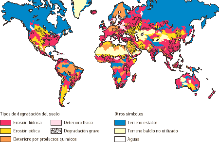 La investigación más exhaustiva realizada hasta la fecha, la Evaluación Mundial de la Degradación de los Suelos (GLASOD), tiene ahora más de diez años de antigüedad. GLASOD calculó que un total de 1 964 millones de ha estaban degradadas, 910 millones de ha lo estaban al menos hasta un grado moderado (con una reducción importante de la productividad) y 305 millones de ha estaba muy degradadas o hasta un punto extremo (no siendo ya adecuadas para la agricultura). La erosión por el agua era el problema más corriente, que afectaba a casi 1 100 millones de ha, seguida por la erosión eólica que afectaba a casi 600 millones de ha.
