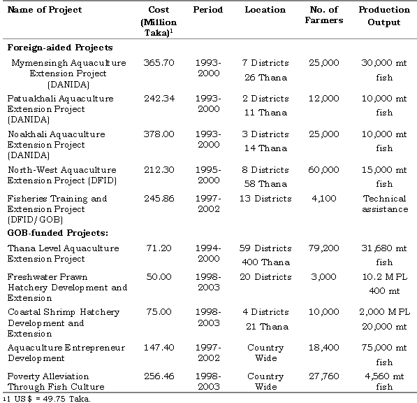 During the Fifth Five Year Plan (1997-2002), 23 Aquaculture Development and Extension Projects have been undertaken. In most of the projects, aquaculture training and extension are considered as major activities. A list of aquaculture extension projects with investment cost, location, number of farmers, expected output and source of funding, is shown in Table 1. The bilateral donor-assisted projects funded by DANIDA and DFID focused on food security, poverty alleviation and income generating activities of rural farmers, whereas, multinational donor (IDA, International Fund for Agricultural Development (IFAD))-assisted projects are mainly for infrastructural/institutional development to increase overall fish production. The Government of Bangladesh (GOB)-funded projects focused on appropriate aquaculture technology and cost effectiveness for all categories of rural fish farmers. It is estimated that nearly 500,000 farmers in rural areas are being provided with technical assistance and extension services, and incidental to this support, about 300,000 mt of fish will be produced by the farmers.