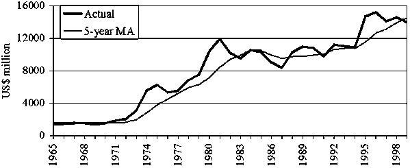 Figure 1 shows total food import bills of LDCs and NFIDCs over the past 35 years (1965-99), along with the five-year moving average. Two aspects of the trend should be taken into account in considering the features of the RF.