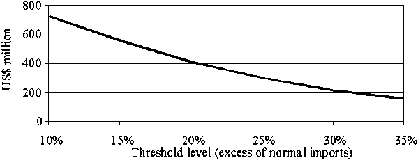 The 1985-99 annual average level of the excess food import bill ranges from US$730 million for a threshold level of 10 percent to US$160 million for one of 35 percent. Thus, the threshold level is the key parameter determining the size of excess food import bills and consequently the size of the RF.