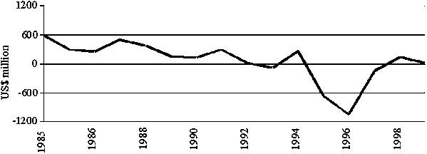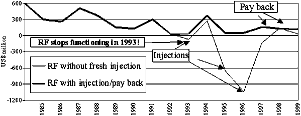 Spikes in the very early years of the RF. What would have been the consequences if the spikes such as occurred in 1995 and 1996 had occurred earlier on, say in 1985 and 1986? Such a change in the sequence of shortfalls would not have altered the mean level of the RF, but would have had implications for the timing of fresh injections (and pay-backs). On this hypothesis, fresh injections of US$600 million would have been required in 1985 and US$500 million in 1986. As the borrowings in 1985 would have been repaid in 1987, the RF would quickly have accumulated a large balance, making it possible to repay US$800 million in 1987 and US$200 million in 1988. The remaining US$100 million could have been re-paid only in 1991 in order to keep the RF operating. Thus, basically, the total size of the RF (US$600 million initial capital and US$1 100 million stand-by) would not be affected nor would the nature of the RF change.