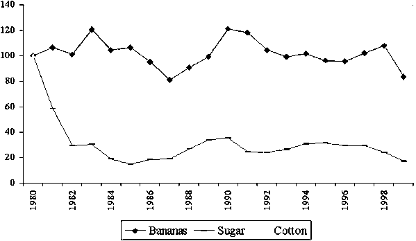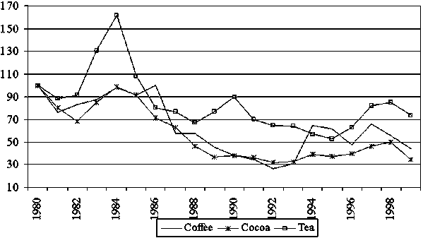 In 1999 the price index of agricultural commodities deflated by the price index of manufactured exports of industrial economies was one half of the average for 1980. For tropical beverages, sugar and cotton, the decline was steeper.