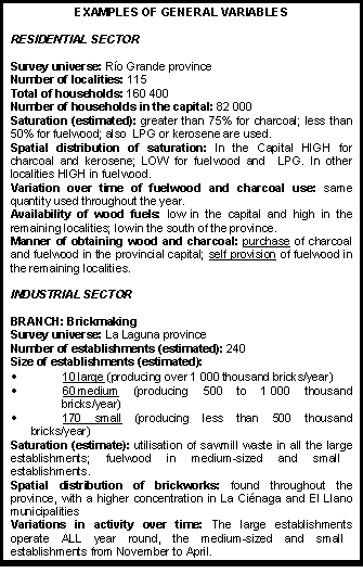 The general variables are: classification of woodfuel end users by sector; size, geographical distribution and variation over time, together with other characteristics of a generic nature.