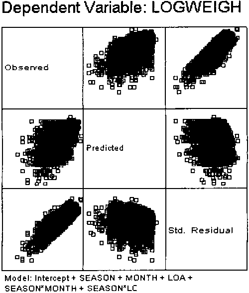 The technique of General linear modelling was used to standardize the catch and effort data. Stem and leaf plots were used to determine the distribution of the catch data for each of the fleets. For the GLMs log-transformed CPUE (catch weight/trip) data were used with season, month and vessel length used as the fixed factor variables. The models were run using the GLM subprogramme of SPSS.. It was noticed that due to the large number of trips during which no flying were taken (i.e. flyingfish catch weight = 0), the model was not normally distributed. As GLM require normally distributed data, the records of 0 catches were left out of the GLM.