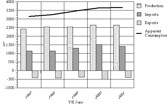 • Imports of packaging and industrial grade were 311 kt for 2000/01. New Zealand accounted for 30 percent of the import market share.