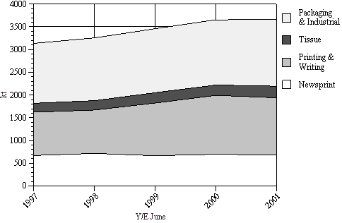 • Newsprint consumption between 1996/97 and 2000/01 has remained reasonably constant at approximately 680 ktpa.
