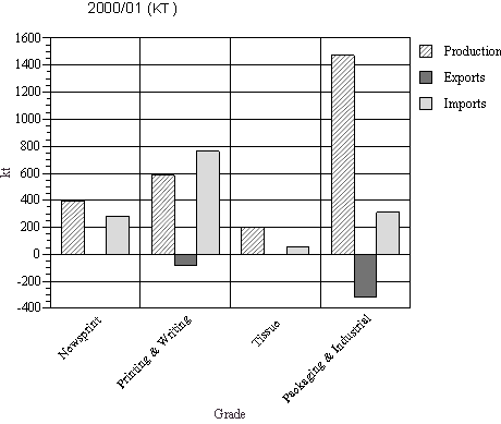 • Production of printing and writing grades in 2000/01 was 586 kt (an increase of 30 kt from the previous year). Imports were down 9 percent to 760 kt and exports were down 14 percent.