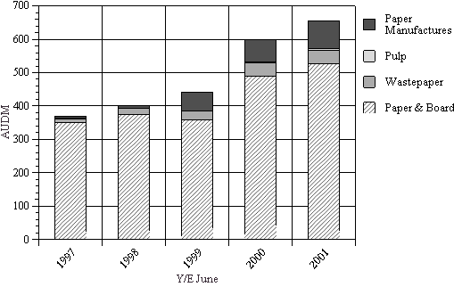 • Exports of printing and writing paper fell slightly (-14 percent) in 2000/01, however since 1996/97, exports have grown at an average rate of 7 percent per annum.