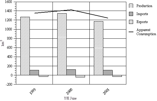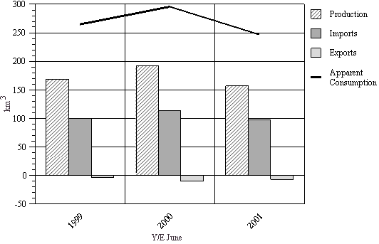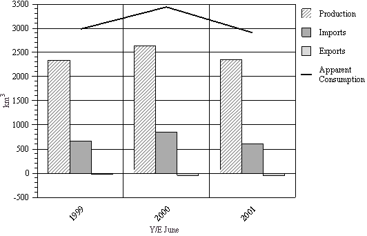 • Imports for 2000/01 fell 36 percent to 88 km3. Shipments from New Zealand were 75 km3, accounting for 85 percent of total imports.